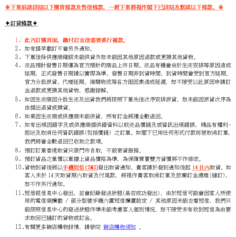 11. 貨物到貨後將以手機短信(SMS)發出取貨通知,貴客請於發到通知後起14日內取貨。如客人未於14天取貨期內取貨及付尾款,將視作貴客取消訂單及放棄訂金處理(撻訂),恕不作另行通知。