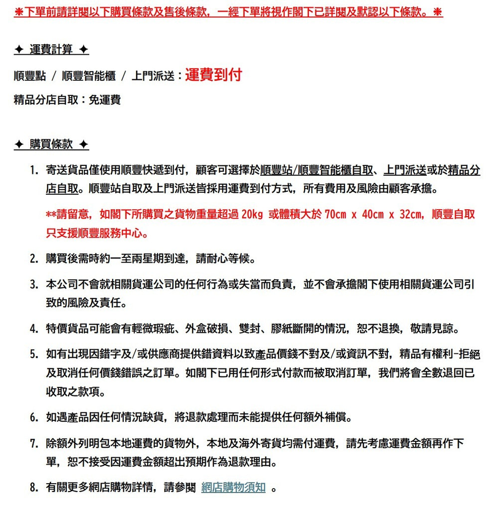 **請留意! 如閣下所購買之貨物重量超過20kg 或體積大於70cm x 40cm x 32cm,順豐自取只支援順豐服務中心。
