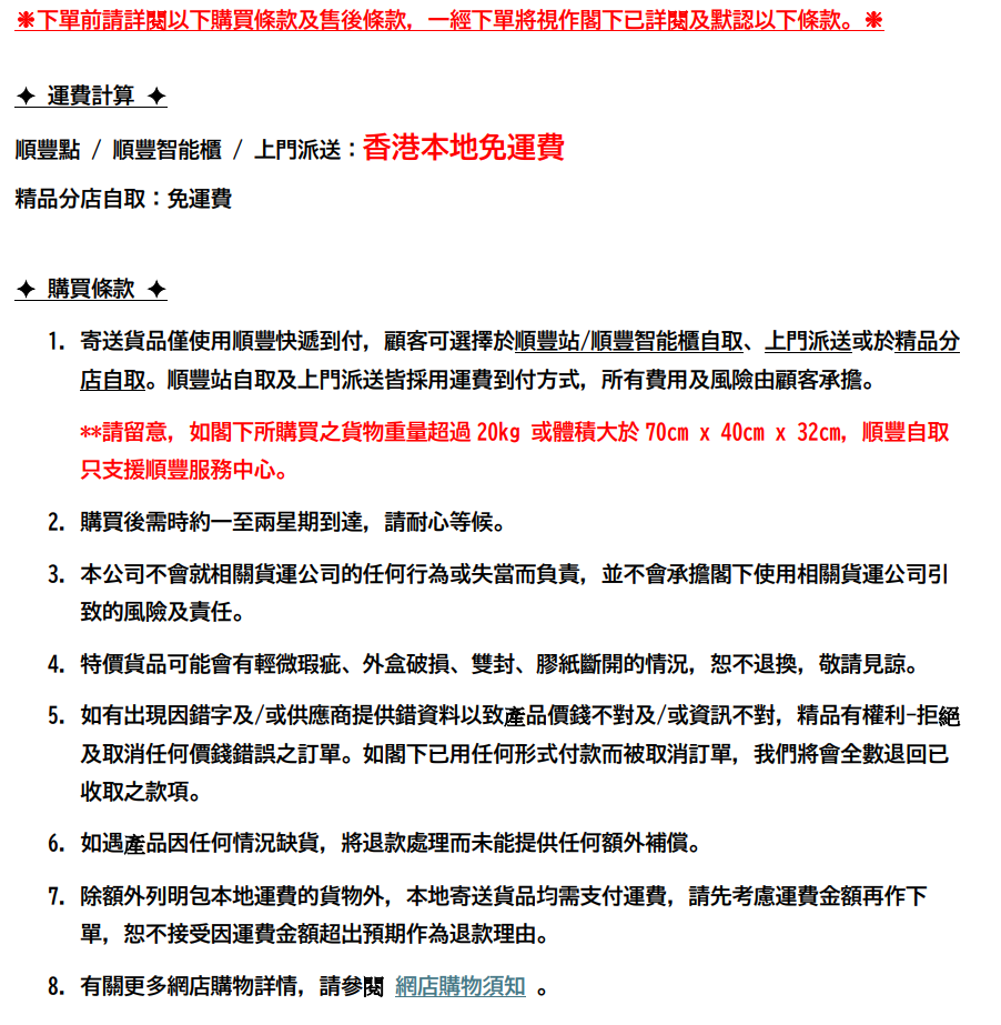 **請留意! 如閣下所購買之貨物重量超過20kg 或體積大於70cm x 40cm x 32cm,順豐自取只支援順豐服務中心。