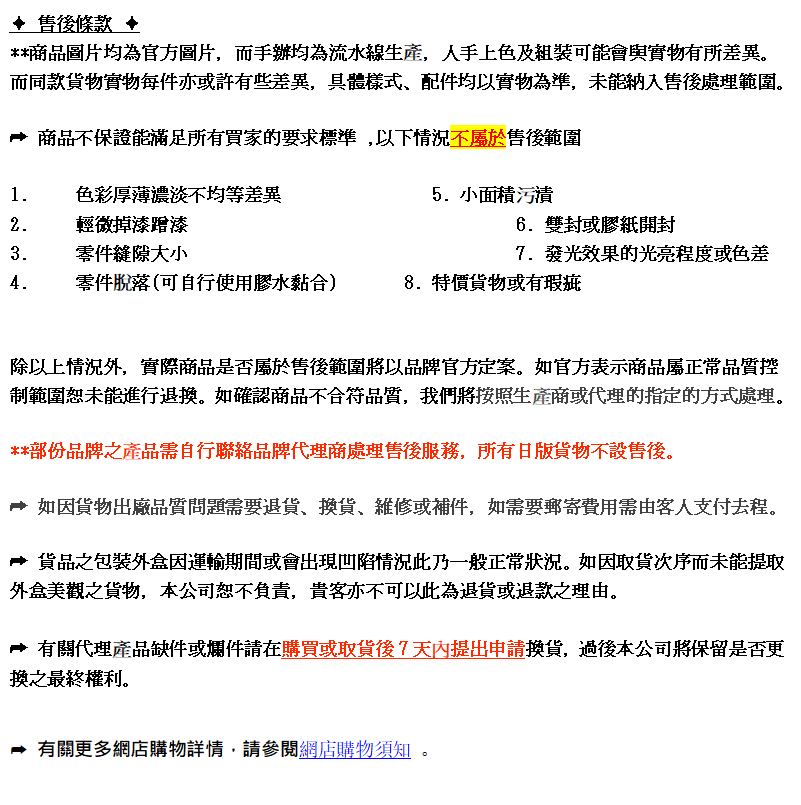 **部份品牌之產品需自行聯絡品牌代理商處理售後服務,所有日版貨物不設售後。