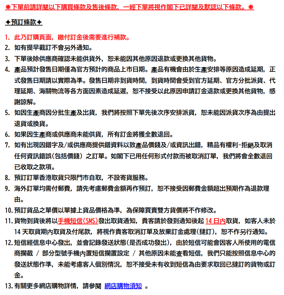 8. 預訂訂單香港取貨只限門市自取,不設寄貨服務。
